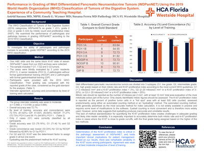CONTEXT: The WHO Classification of Tumors of the Digestive System (2019) categorizes WDPanNETs as grade 1 (G1), grade 2 (G2) or grade 3 (G3) by mitotic count and proliferative index (KI67). We examined the performance of pathologists and pathology trainees in grading WDPanNET according to the 2019 WHO Classification.