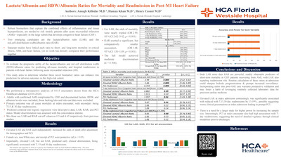 METHODS We performed a retrospective analysis of 8 115 encounters drawn from the HCA Healthcare database (2016-2024). Adults with confirmed AMI complicated by CHF and documented lactate, RDW, and albumin levels were included; those lacking labs and relevant data were excluded. Primary outcome was all cause mortality at index encounter, with secondary being 7,15 & 30-day readmissions. Predictors entered into logistic regression were descriptives, LAR, RAR, and PCI status. Model discrimination was assessed with the concordance statistic. We chose our LAR and RAR cutoff values as 0.5 and 4.65 respectively from previous studies.