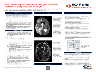 Introduction: This case study explores an uncommon triad of encephalitis, ventriculitis, and meningitis complicated by ischemic strokes and seizures in a COVID-19-positive patient. Prior studies suggest that bacterial meningitis and encephalitis can lead to cerebral infarctions due to inflammation and vascular injury.1,2,5 Ventriculitis, in particular, is rarely observed and typically is seen as a severe complication of meningitis, and can be managed with neurosurgical interventions such as CSF shunt placement, ventricular drains, or other intracranial devices.3,4 The simultaneous presentation of all three conditions in a single patient is rare and poses significant challenges from a diagnostic and management standpoint.
