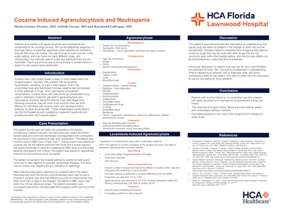 Introduction: Cocaine use in the United states is seen in many cases within the hospital system. Typically, they present with tachycardia, hypertension, sweating, even heart attack. Due to the uncontrolled sale and distribution of drugs, patients can be exposed to other additives in drugs which can lead to unexpected complications. Cocaine laced with levamisole (an antiparasitic drug used in veterinary medicine) can lead to agranulocytosis and neutropenia. Cocaine being the second most used illegal drug following marijuana it may be much more common than we think. Millions of individuals use cocaine yearly and develop a heavy addiction with use of other drugs as well. These undetectable combinations can be life-threatening and misleading in treatments and procedures that patients undergo within the hospital system.