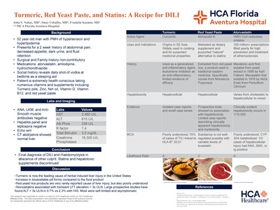 Introduction Drug induced liver injury (DILI) contributes to a significant portion of acute liver injuries and acute liver failure in the west. DILI accounts for approximately 11% of acute liver failure cases in the US according to ACG. Insulting agents are numerous and well documented in the NIH LiverTox database, however the rarity and complexity of individual agents is a matter of ongoing study. Case Description/Methods A 52 year old man with PMH of HTN and HLD presents for a 2 week history of abdominal swelling, bilateral lower extremity swelling, decreased appetite, and positional shortness of breath. He endorses occasionally drinking an oz. of vodka before bed to fall asleep but denied heavy binge drinking. His medications were amlodipine, HCTZ, and atorvastatin. Of note this patient was very health conscious and took a regimen of natural remedies including turmeric pills, red yeast paste, Zinc, and fish oil. Labs were significant for ALT = 815 u/L, AST = 2480 u/L, Alk Phos = 238 u/L, T. Bilirubin = 3.2 mg/dL and creatinine phosphokinase (CPK) = 18,000 u/L. An infectious workup was negative for viral hepatitis, syphilis, and Leptospira. Immunological workup was negative for ANA, Anti-smooth muscle ab, and Anti-LKM ab. An abdominal US revealed trace subhepatic ascites. Portal vein US showed patent hepatopetal flow. CT scan showed a normal size and contour of the liver. An echocardiogram showed normal left ventricle with 55% ejection fraction. After home medications were discontinued, the liver function tests and CPK trended down. Spironolactone helped reduce swelling. Discussion This is a case of new onset hepatocellular pattern (R factor 7.4) acute liver injury without past chronic hepatic disease. DILI second to atorvastatin, turmeric, and Red Yeast use was the presumed diagnosis as these agents have likelihood scores of A, B, and C respectively. Although statins are a class A cause of liver injury, the incidence of a >3x elevation of ULN is exceedingly rare (< 1% of cases) In the case of turmeric induced DILI, most cases present with mild elevations of Alk. Phos. and marked elevation of AST and ALT ( > 1000). Interestingly most reports of turmeric induced DILI had a combination of multiple offending agents such as this case. Red yeast is a traditional Chinese herbal remedy containing monacolin K, an identical agent to lovastatin. Prospective controlled studies do not show a significant enzyme increase in LFTs, but there are isolated case reports with liver injury second to consumption of red yeast.