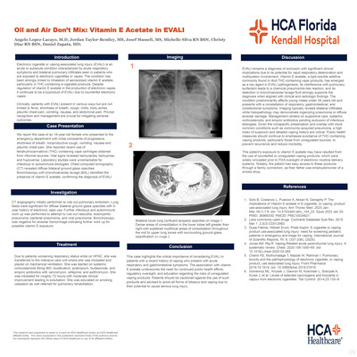 Introduction: Electronic cigarette or vaping-associated lung injury (EVALI) is an acute or subacute condition characterized by acute respiratory symptoms and bilateral pulmonary infiltrates seen in patients who are exposed to electronic cigarettes or vapes. The condition has been strongly linked to inhalation of aerosolized vitamin E acetate, particularly in THC-containing e-cigarette products. Despite regulation of vitamin E acetate in the production of electronic vapes, it continues to be a byproduct of EVALI due to counterfeit electronic vapes. Clinically, patients with EVALI present in various ways but are not limited to fever, shortness of breath, cough, chills, body aches, pleuritic chest pain, vomiting, nausea, and abdominal pain. Prompt recognition and management are crucial for mitigating adverse outcomes. Case Presentation: We report the case of an 18-year-old female who presented to the emergency department with initial complaints of progressive shortness of breath, nonproductive cough, vomiting, nausea and pleuritic chest pain. She reported recent use of tetrahydrocannabinol (THC) containing vape cartridges obtained from informal sources. Vital signs revealed tachycardia, tachypnea, and hypoxemia. Laboratory studies were unremarkable for infectious or autoimmune etiologies. Chest computed tomography (CT) revealed diffuse bilateral ground-glass opacities. Bronchoscopy with bronchoalveolar lavage (BAL) identified the presence of vitamin E acetate, confirming the diagnosis of EVALI. Investigations CT angiography initially performed to rule out pulmonary embolism. Lung fields were significant for diffuse bilateral ground-glass opacities with 5-year history of electronic vape use. Further infectious and autoimmune work up was performed to attempt to rule out vasculitis, eosinophilic pneumonia, bacterial pneumonia, and viral pneumonia. Bronchoscopy was negative for alveolar hemorrhage indicating further work up for possible vitamin E exposure. Treatment Due to patients worsening respiratory status while on HFNC, she was transferred to the intensive care unit where she was intubated and placed on mechanical ventilation. She was started on systemic corticosteroids 60mg BID, levalbuterol, ipratropium, budesonide, and empiric antibiotics with vancomycin, cefepime, and azithromycin. She was intubated for roughly 72 hours with moderate clinical improvement leading to extubation. She was educated on smoking cessation as well referred for pulmonary rehabilitation. Discussion: EVALI remains a diagnosis of exclusion with significant clinical implications due to its potential for rapid respiratory deterioration and multisystem involvement. Vitamin E acetate, a lipid-soluble additive commonly found in illicit THC-containing vape products, has emerged as a key agent in EVALI pathogenesis. Its interference with pulmonary surfactant leads to a chemical pneumonitis-like reaction, and its detection in bronchoalveolar lavage fluid strongly supports the diagnosis when aligned with clinical and radiologic findings. The condition predominantly affects young males under 35 years old and presents with a constellation of respiratory, gastrointestinal, and constitutional symptoms. Imaging typically reveals bilateral infiltrates, while histopathology may demonstrate organizing pneumonia or diffuse alveolar damage. Management centers on supportive care, systemic corticosteroids, and empiric antibiotics pending exclusion of infectious etiologies. Given the nonspecific presentation and overlap with more common conditions such as community-acquired pneumonia, a high index of suspicion and detailed vaping history are critical. Public health measures should continue to emphasize avoidance of THC-containing vaping products, particularly those from unregulated sources, to prevent recurrence and reduce morbidity. This patient’s exposure to vitamin E acetate may have resulted from the use of counterfeit or unregulated vaping products, which were widely circulated prior to FDA oversight of electronic nicotine delivery systems. Notably, the patient had easy access to these products through a family connection, as their father was employed/owner of a smoke shop. Conclusion: This case highlights the critical importance of considering EVALI in patients with a recent history of vaping who present with acute respiratory and gastrointestinal symptoms. The association with vitamin E acetate underscores the need for continued public health efforts, regulatory oversight, and education regarding the risks of unregulated vaping products. Patients should be cautioned against the use of such products and advised to avoid all forms of tobacco and vaping due to their potential to cause serious lung injury.