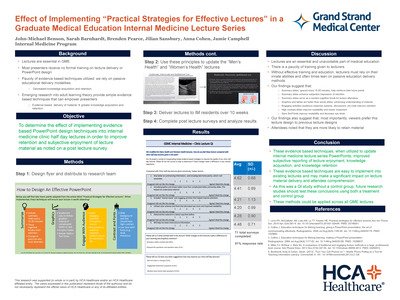 - Best Poster - Quality Improvement: Effect of Implementing Practical Strategies for Effective Lectures in a Graduate Medical Education Internal Medicine Lecture Series - John-Michael Benson, MD; Internal Medicine